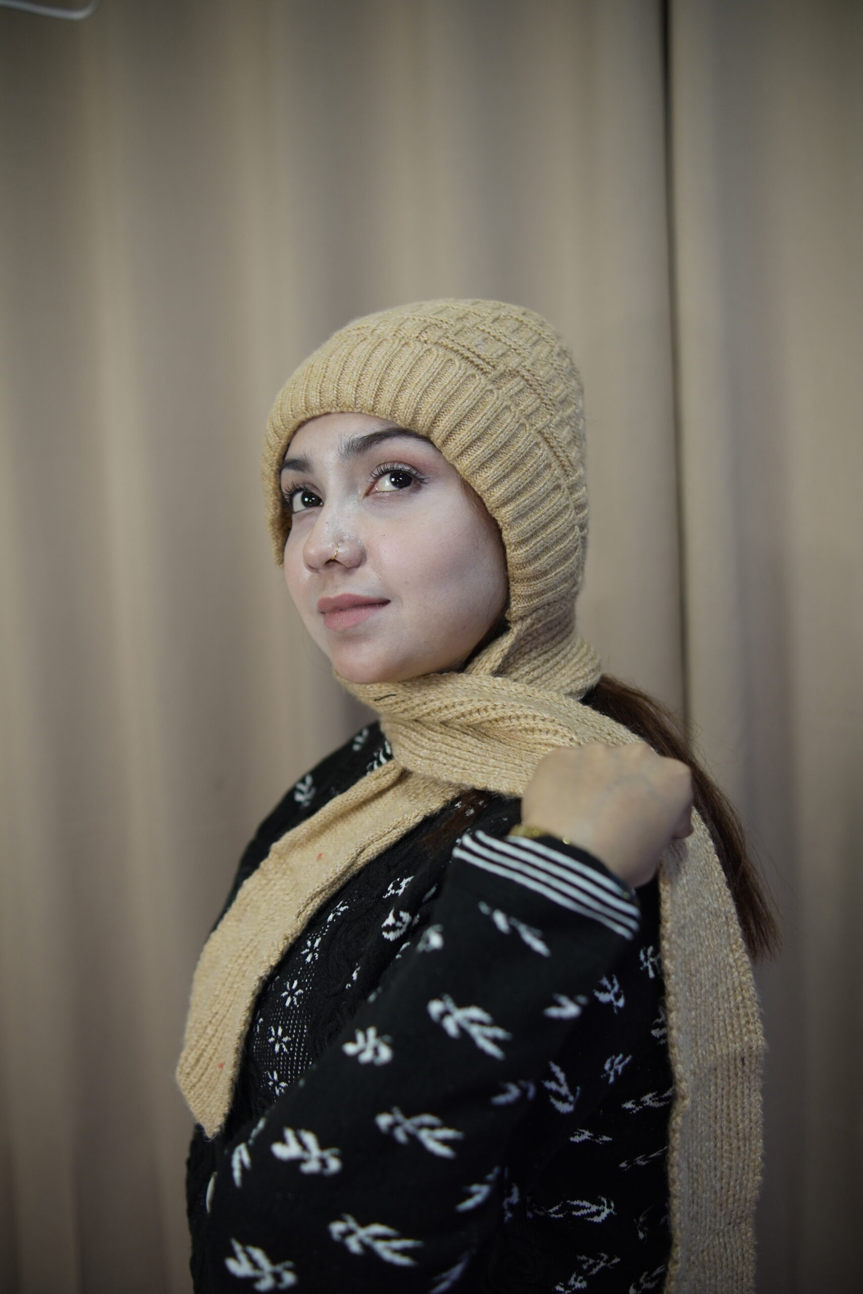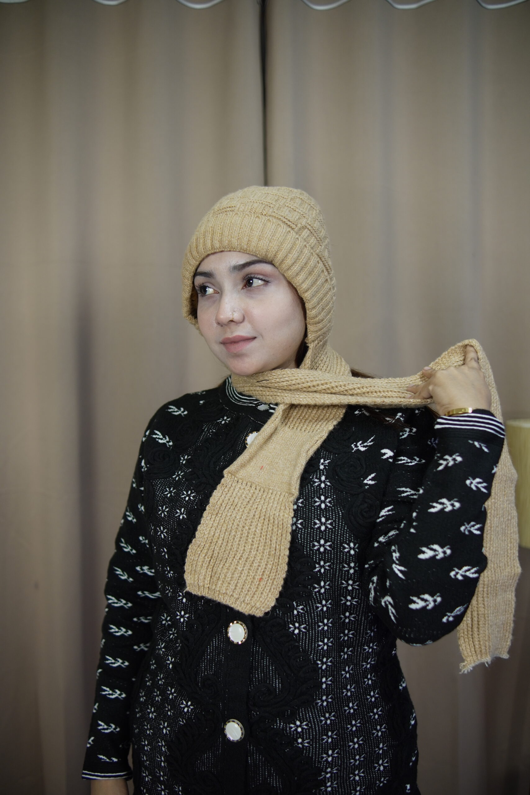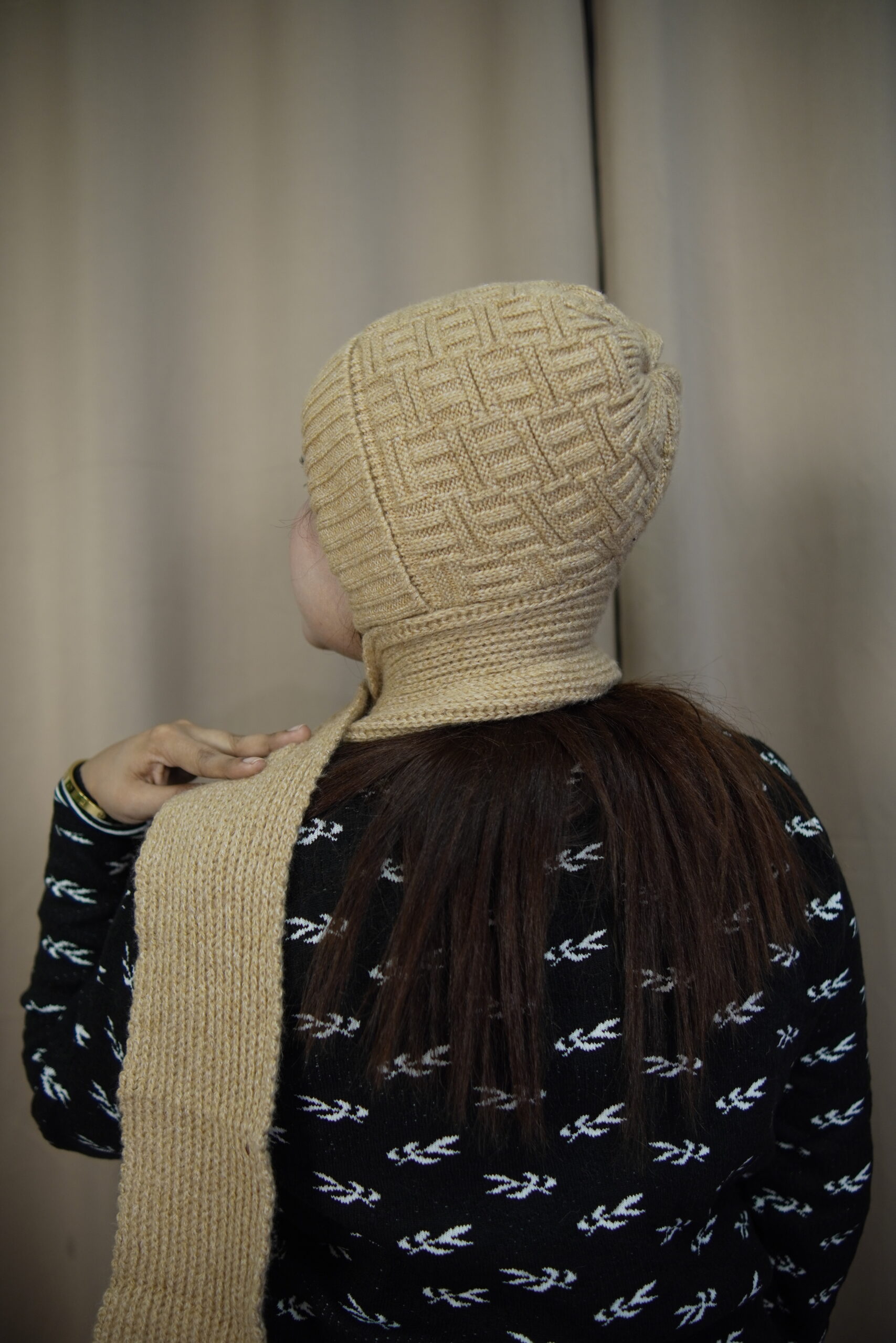 বেইজ রঙের নিট টুপি, জ্যামিতিক ডিজাইনের ছোঁয়ায়—আপনার শীতকালীন লুকের জন্য পরিপূর্ণ আরাম ও স্টাইল।